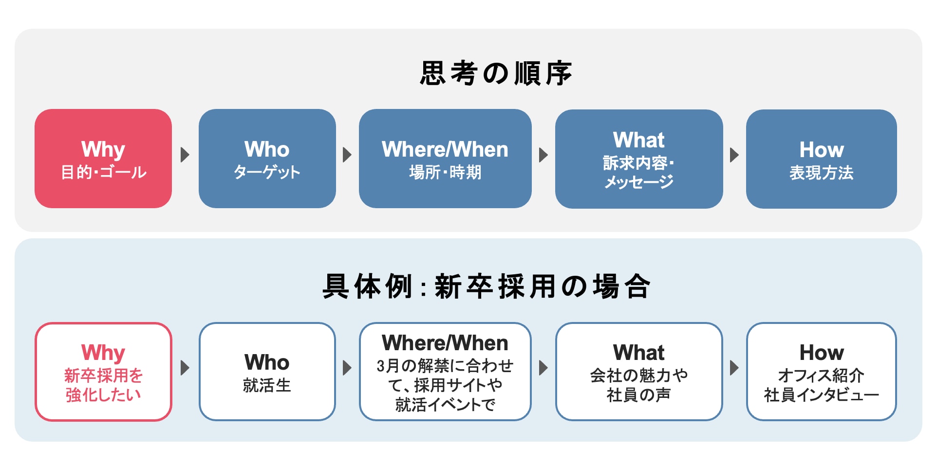 例えば、「新卒採用を強化したい(Why)」という目的なら、ターゲットは「就活生(Who)」となり、配信場所は「採用サイトや就活イベント(Where)」が適切です。