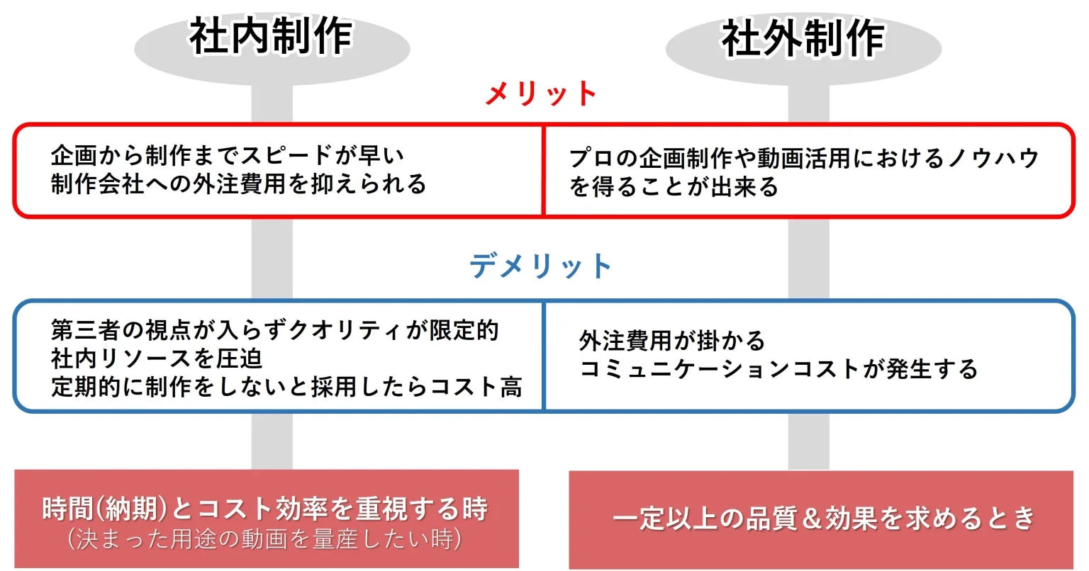 ビジネスで動画を活用するにあたり、今回ご紹介をしたiMovieなどの編集ソフトを活用した内製と外注を使い分けるのも一つのポイントになるかと思います。 以下に、社内制作と社外制作のメリット・デメリットをまとめていますのでご参考にしてみてください。