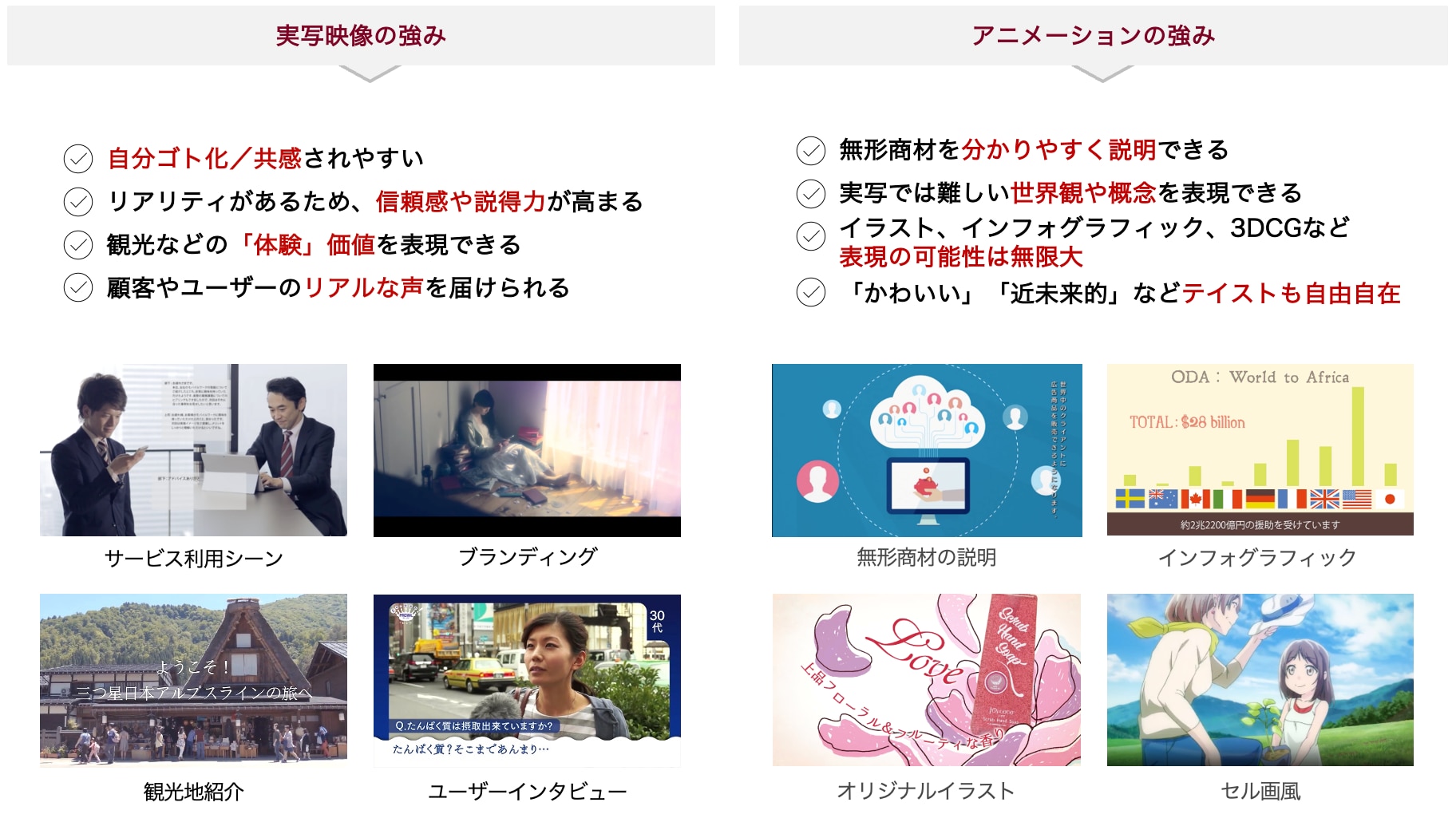 実写動画の最大の武器は、現実世界に基づいた圧倒的な「リアリティ」と「エモーショナルな訴求」です。