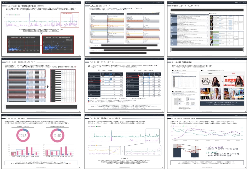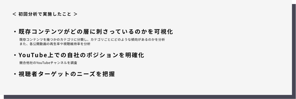 戦略立案フェーズでは、すでに別会社さんで約 2年間ほど運用されている状態でもあったので、LOCUSとしては、初回分析というステップを踏みました。チャンネル・コンテンツ分析を行い、これまで運用されてきた中での良かったこと、逆に効果があまり見られなかったものがどういった動画なのか整理していきました。さらに、市場・競合分析で、マーケットの傾向や特徴、視聴者のニーズを見極め、チャンネルが⽬指していくべきコンテンツの⽅向性を明らかにしていきました。