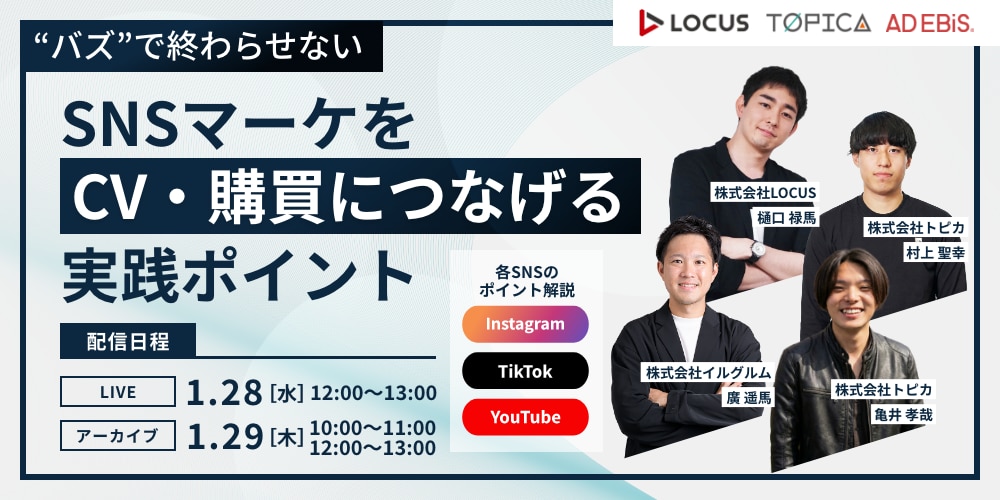 | 株式会社トピカ 「バズ」から「売上」へ。行動を生み出すSNS設計図 株式会社LOCUS 目的別に使い分ける。成果直結のYouTube運用術 株式会社イルグルム 見えない効果を可視化する。SNS施策の正しい評価軸 |